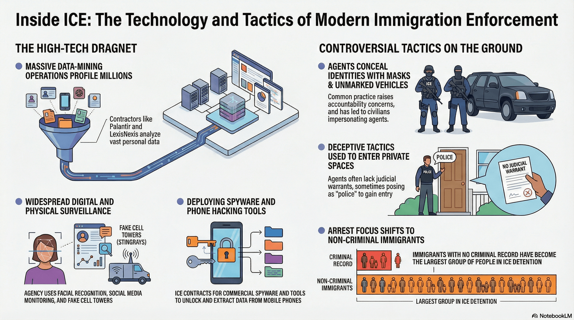 Taken together, these tools—from commercial data brokers to warrantless cell phone tracking—transform ICE from a traditional enforcement agency into a modern surveillance apparatus capable of building detailed digital dossiers on millions of people with minimal judicial oversight.